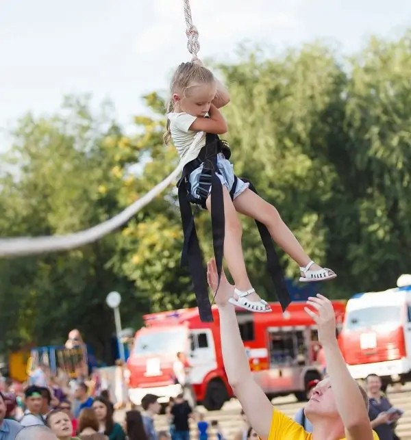 Первый экспериментальный отрыв от земли состоялся в 15:30. Детей-добровольцев надёжными страховочными тросами закрепляли на летающей конструкции и аккуратно поднимали в воздух. Всего в небо удалось запустить 18 мальчишек и девчонок.