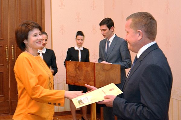 Сергей Горбань вручает благодарственное письмо редактору портала donnews.ru Марине Поюровой