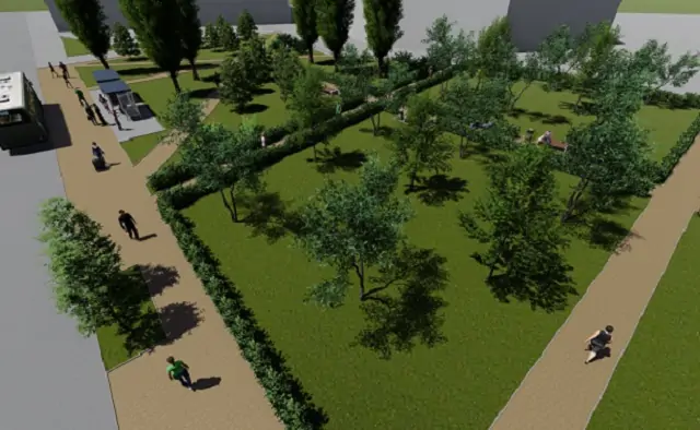 По предварительному плану здесь могут появиться две аллеи, тротуары, освещение, скамейки и урны. Помимо этого, пешеходную зону дополнят озеленением — уложат газоны, высадят ясень, липу, рябину, чёрную сосну, можжевельник и другие растения. Небольшую часть территории, около 50 метров, займёт дорога для обслуживающего транспорта, так как на этом участке много подземных коммуникаций. Все деревья, которые есть на территории сейчас, вырубать не будут.