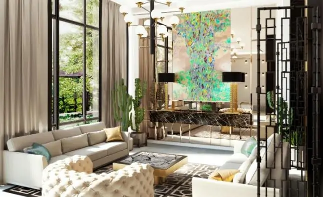 На первом этаже дома располагаются бассейн для жильцов, каминная зона, библиотека и спортзал.