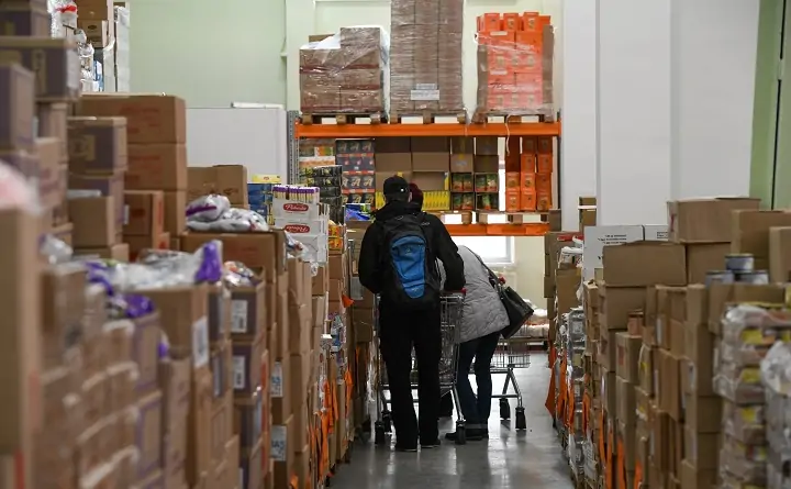 Но то, что особенно бросается в глаза — отсутствие прилавков. Товары продают прямо с паллетов, стоящих один на другом.