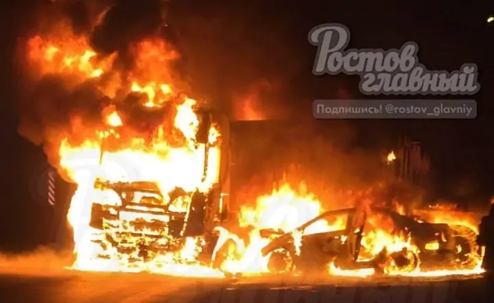 Жуткая авария произошла вечером 12 января на Восточном шоссе Батайска: Toyota Corolla врезалась в грузовик, после чего они загорелись.