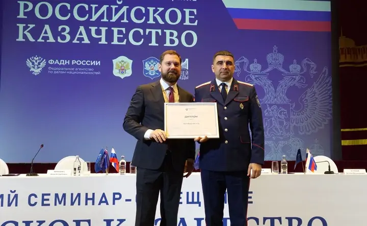 Диплом руководителю делегации Ростовской области, заместителю губернатора региона, атаману Всевеликого войска Донского Сергею Бодрякову вручил руководитель Федерального агентства по делам национальностей (ФАДН) Игорь Баринов.