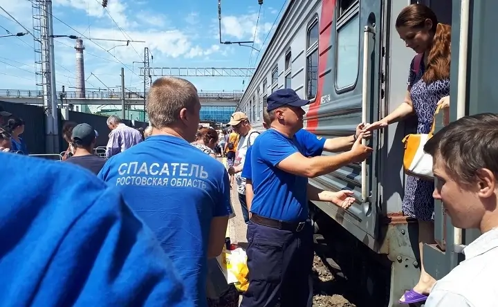 Беженцев встретили на перроне специалисты областной службы спасения на водах, муниципальные спасатели, а также сотрудники Донского спасательного центра и психологи МЧС. Они помогли приехавшим выйти из вагонов поезда и выгрузить багаж. На площади перед зданием вокзала жителей Мариуполя уже ждали автобусы.