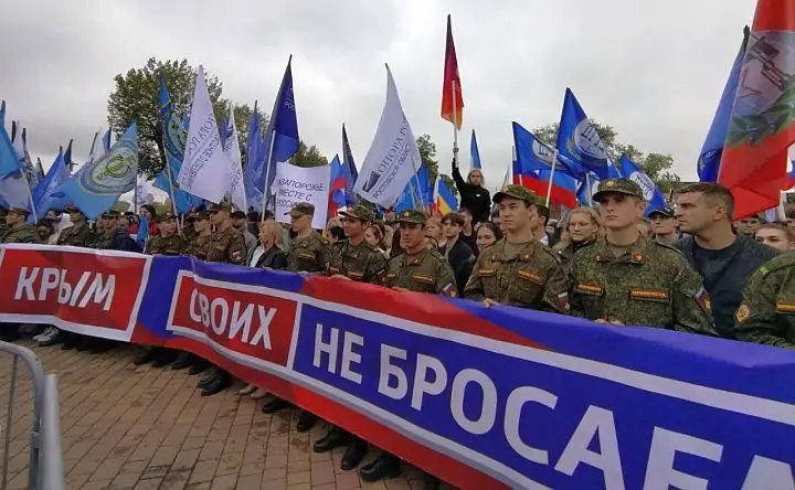 Открылся митинг словами поддержки жителей Донбасса и украинских областей, участвующих в референдуме. Все выступающие вспоминали присоединение Крыма, рассказывали о том, сколько раз доставляли гуманитарные грузы на Донбасс, и сходились во мнении, что именно референдум позволит «закончить кошмар» для жителей ДНР, ЛНР, Херсонской и Запорожской областей.