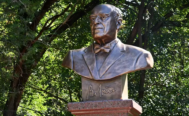 В пятницу, 22 сентября, в Аксае состоялось торжественное открытие бюста народного артиста СССР, участника Великой Отечественной войны Владимира Этуша. Его городу подарил автор проекта Михаил Сердюков, а постамент был изготовлен на средства городского бюджета.