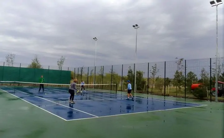 На площадке использовали систему теннисного покрытия «Хард» на резиновой подложке из шести слоёв. По периметру спортивной площадки установили мощное освещение из 12 прожекторов.