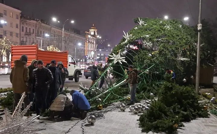 В Ростове вечером, 14 января, сильный ветер снёс главную городскую ёлку возле парка Горького. Как сообщили очевидцы в соцсетях, в момент падения рядом с ёлкой проходили люди, но, к счастью, никто не пострадал.