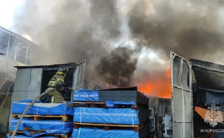 К 13:10 площадь горения увеличилась до 500 квадратных метров. В МЧС подтвердили, что горит склад с поликарбонатом.