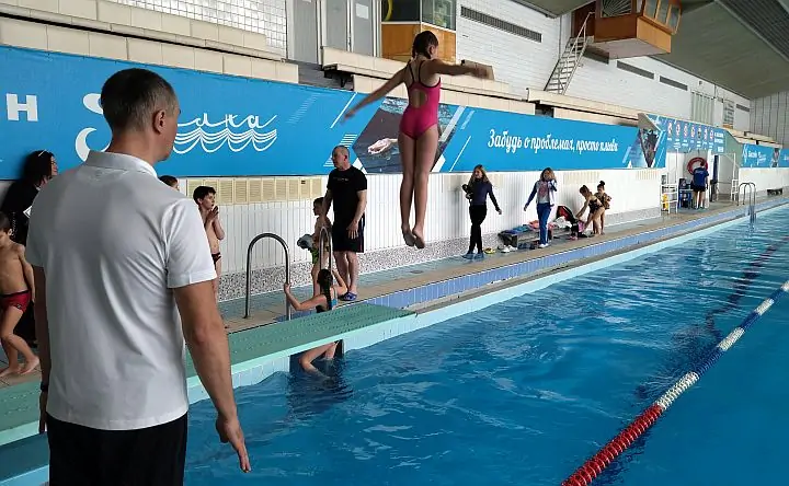 Стоит отметить, что занятия в спортшколе бесплатные. Первую открытую тренировку в бассейне «Волна» провёл самый титулованный в мире прыгун в воду Дмитрий Саутин.
