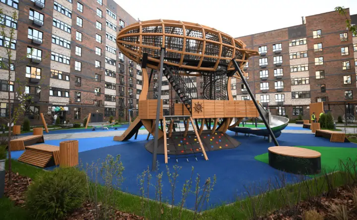 Игровая площадка в форме большого дирижабля сразу понравилась самым маленьким жителям квартала. Рядом с ней — зоны для активных тренировок и спокойного отдыха. Для удобства жителей в доме есть подземный паркинг, на который можно спуститься со своего этажа.