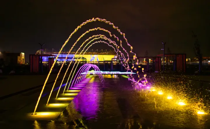 Водные композиции формируются 143 струями высотой до четырёх метров на протяжении всей центральной аллеи. В ночное время каскады освещают более 160 светильников.