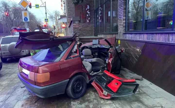 В Ростове утром, 25 декабря, на Красноармейской 21-летний водитель Audi, двигаясь по крайней левой полосе, столкнулся с автобусом № 98. После удара иномарка врезалась в здание ресторана Matador.