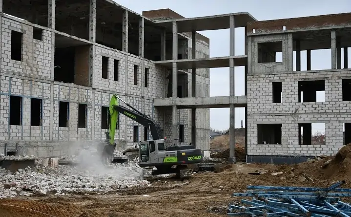 На территории школы прокладывают коммуникации, усиливают железобетонные конструкции. В ближайших планах — приступить к монтажу кровли.