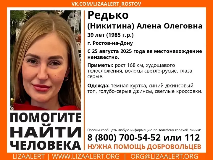 По данным поискового отряда «ЛизаАлерт», пропавшую женщину зовут Алёна Редько, ей 39 лет. В день исчезновения она была одета в тёмную куртку, синий джинсовый топ, серо-голубые джинсы и светлые кроссовки.
