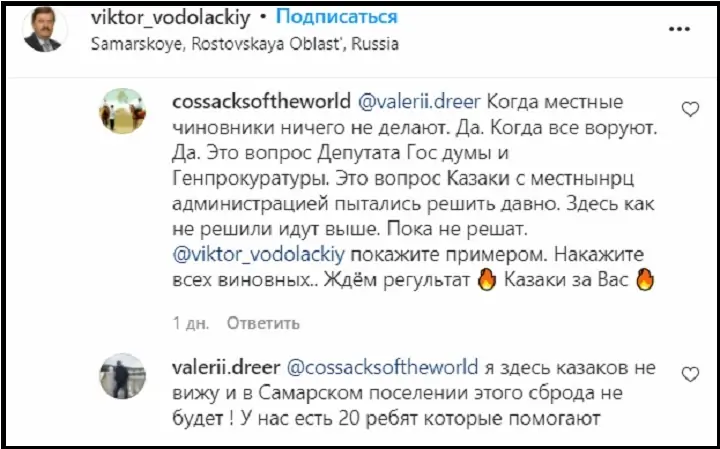 Подписчики Водолацкого ответили, что когда местные чиновники ничего не делают для решения проблемы, то остаётся надеяться только на казаков. Реакция Дреера на этот комментарий оказалась резкая.