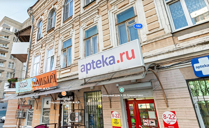 Здание на Пушкинской, 132/59, известно как доходный дом Хаи Шлёмовны Гринштейн. Оно построено в конце XIX века, в оформлении использовался штукатурный декор, характерный для неорусского направления эклектики. Но со временем часть декора была утрачена. Больше всего дом известен тем, что когда-то в нём жил городской архитектор Григорий Васильев. На первом этаже хозяйка держала торговое заведение с бакалейным товаром. Также в доме были квартиры для состоятельных жильцов с парадным входом и небольшие комнатки на верхних этажах, куда можно было попасть через ворота по дворовой металлической лестнице. Сейчас в доме располагаются магазины, аптека и ресторан.