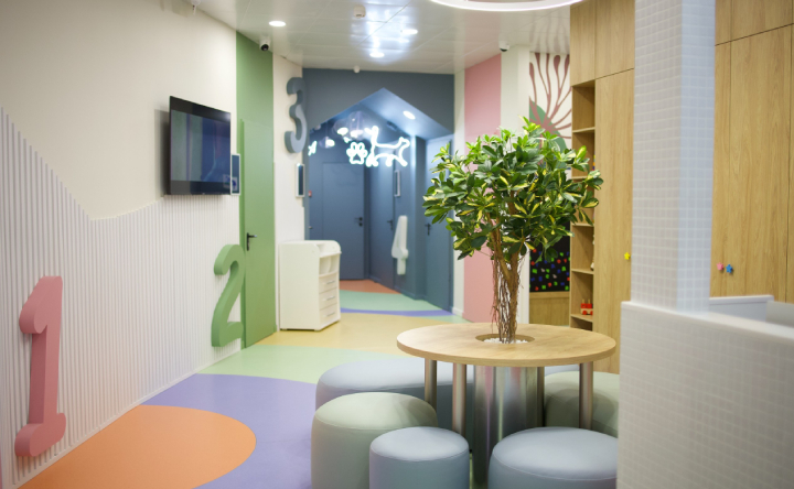 В клинике два раздельных входа, каждый со своей регистратурой. Первый предназначен для плановых осмотров, а второй — для заболевших и пациентов с температурой. На территории детского корпуса есть парковка для колясок, детские зоны и качели.