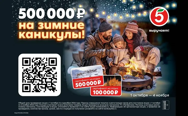 «Пятёрочка» с 1 октября запустила новую акцию «500 000 рублей на зимние каникулы». Торговая сеть разыграет среди участников подарки, а главным призом станет денежный сертификат.