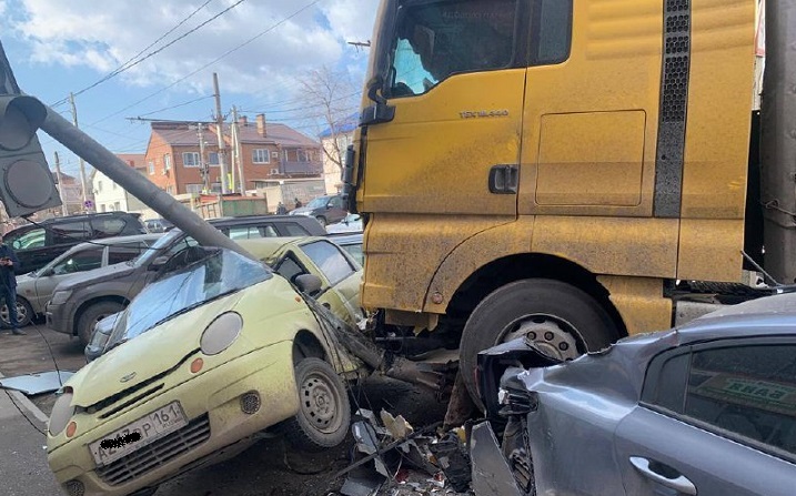В Ростове на Таганрогской 66-летний водитель фуры МАN не справился с управлением, вылетел на обочину, врезался в светофор и снёс три иномарки, припаркованных около «Магнита». Как сообщает отдел пропаганды регионального УГИБДД, речь идёт о Kia Rio, Daewoo Matiz и Skoda Octavia.