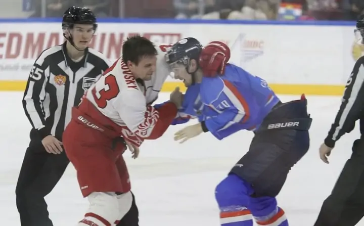 Два соперника что-то не поделили во время игры и подрались прямо на льду. На кадрах видно, что разнимать их особо никто не спешил. И только когда оба хоккеиста повалили друг друга на лёд, судьи разняли спортсменов.