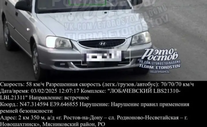 В Мясниковском районе, на втором километре +350 метров дороги Ростов — Радионово-Несветайская — Новошахтинск, заработала камера, которая фиксирует нарушение правил применения ремней безопасности. Водители, которым уже пришли штрафы за это нарушение в размере 1500 рублей, уточнили, что камера стоит в Ленинакане перед поворотом на Суворовский со стороны Ростова.
