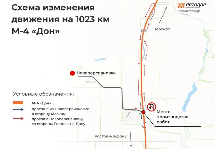 Для транспортных средств жителей посёлка Новоперсиановка, следующих с южного направления, предусмотрели разворот на 1018-м километре трассы М4 «Дон». Водителей попросили учитывать временные изменения при планировании маршрута и соблюдать схемы организации дорожного движения.