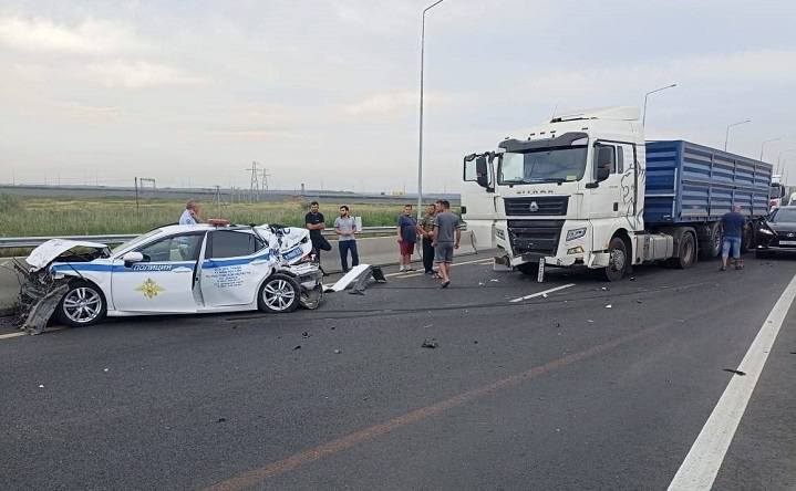 На трассе М4 «Дон» в Аксайском районе патрульная машина Toyota Camry при развороте с включёнными проблесковыми маячками и звуковым сигналом столкнулась с большегрузом, которым управлял 32-летний водитель, сообщили в отделе пропаганды ГИБДД по Ростовской области.