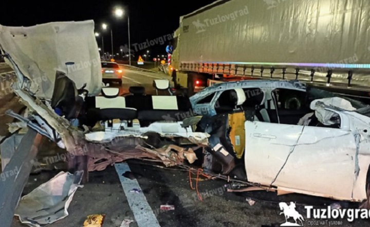 Иномарка на полной скорости вразалась правой стороной в левый угол полуприцепа, отчего её буквально разорвало на части.
