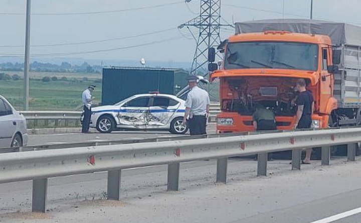 По информации «Ёрш.Азов», попавшая в аварию Skoda Octavia — это полицейский автомобиль.