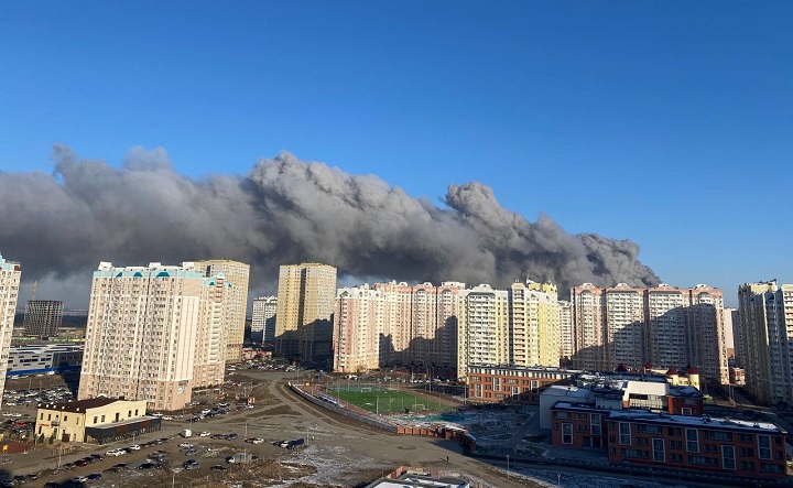 По уточнённым данным МЧС, площадь пожара увеличилось до 1,8 тысячи квадратов. Горят поддоны, частично обрушилась кровля.