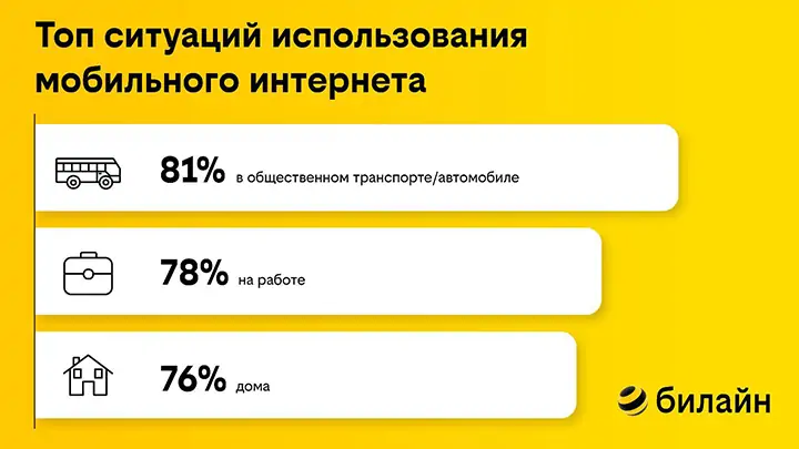 Оператор билайн провёл опрос среди клиентов, чтобы узнать, в каких ситуациях они пользуются мобильным интернетом. Самым популярным оказался вариант «при поездке в транспорте».