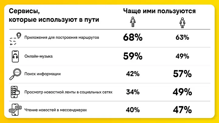 Интересно, что у респондентов разного пола и возраста наблюдаются достаточно заметные различия в использовании онлайн-сервисов в транспорте. Так, женщины в пути значительно чаще, чем мужчины, просматривают новостную ленту в социальных сетях (49% и 34% соответственно) и публикуют там же фотографии и видео (37% и 26%). Мужчины в дороге чаще отдают предпочтение музыкальным онлайн-сервисам (59% против 49%).