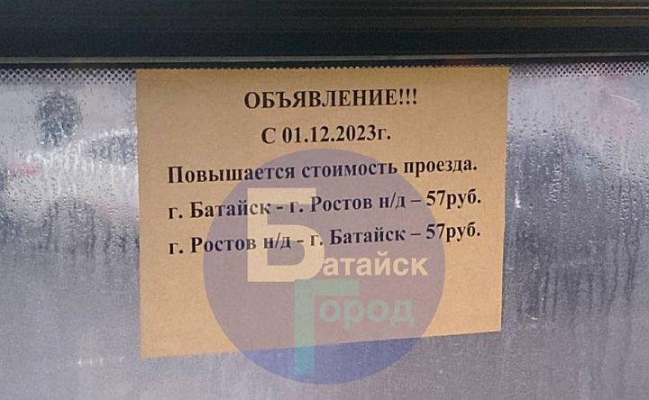 1 декабря на 7 рублей — до 57 рублей — подорожает проезд в автобусах, курсирующих между Ростовом и Батайском. Соответствующие объявления появились в общественном транспорте. Эту же информацию подтвердили «Батайск городу» в батайском АТП-1.