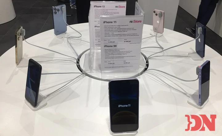 Вечером 3 марта в магазине re:Store в ТЦ «Горизонт» практически нет посетителей. Около витрины с айфонами стоит покупатель и расспрашивает продавца о наличии новых iPhone 13-й модели. Тот с сожалением сообщает, что айфоны 12-й и 13-й модели уже разобрали, а на витрине стоят образцы, которые продаже не подлежат.