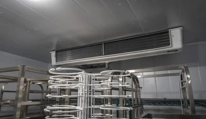 В этих цехах и других кухонных помещениях установлена приточная вентиляция с подогревом воздуха через водяной калорифер. Воздух подается непосредственно через потолочные анемостаты, а управление системой осуществляется с помощью автоматики и контроллера.