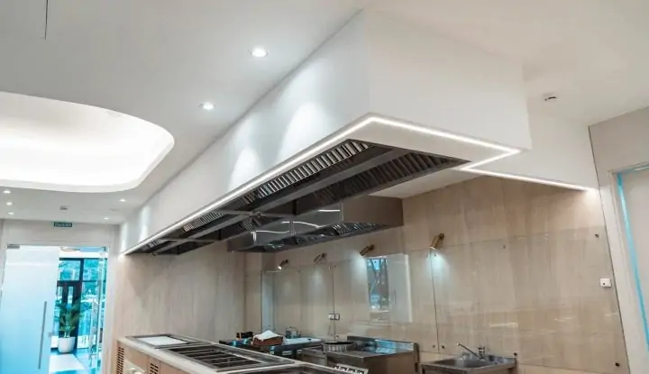 В кухонном помещении особое внимание уделено вытяжной системе, поскольку во время приготовления пищи образуется большое количество пара и жира, а также запахов. Для обеспечения комфортной работы персонала мы организовали удаление воздуха через потолочные анемостаты, а также установили пристенные и островные вытяжные зонты с лабиринтными жироулавливающими фильтрами.
