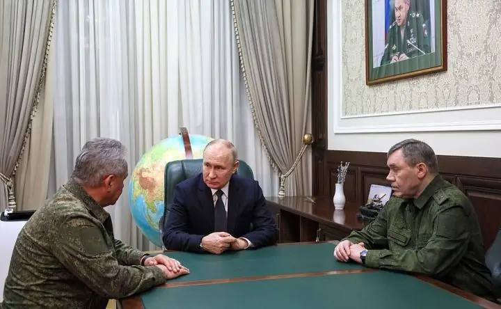 Президента в штабе сопровождали министр обороны Сергей Шойгу, начальник Генерального штаба Вооружённых Сил РФ Валерий Герасимов и другие военачальники.