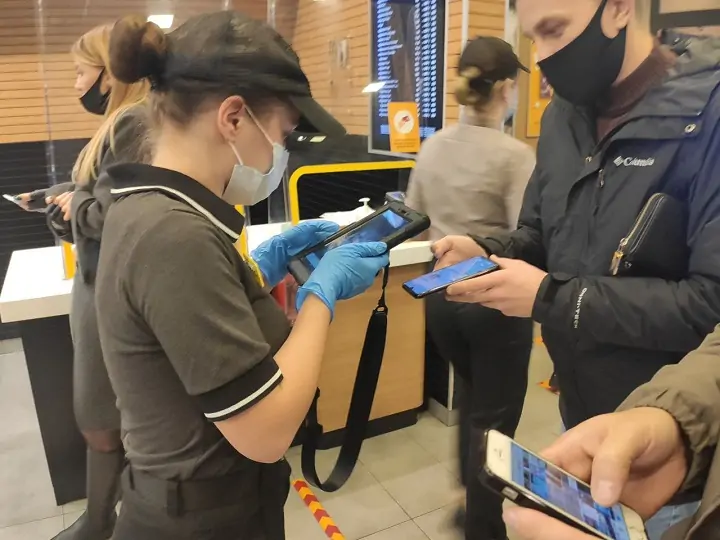 В «Макдональдсе» девушка-контролёр тщательно сверяла у входа QR-коды посетителей через специальное устройство. Правда, прибор не распознал код от сделанной прививки, который ещё не действует.