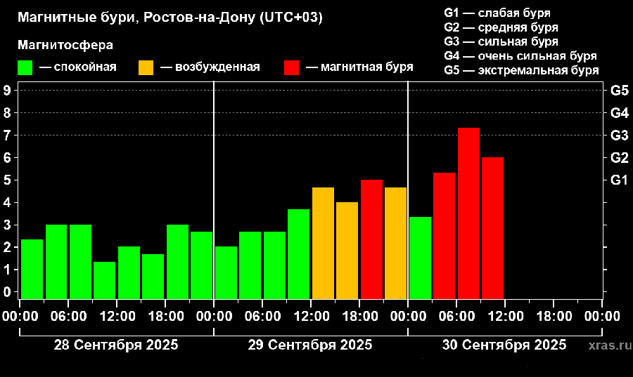 30 сентября Ростов накрыла магнитная буря, превышающая по мощности уровень G3, следует из данных лаборатории солнечной астрономии ИКИ РАН.