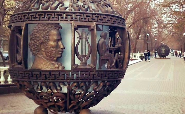Напомним, что композиция пока из двух сказочных шаров, расположенная на пересечении Пушкинской и Кировского, иллюстрирует жизнь и творчество Александра Пушкина. Создал пушкинские шары ростовский скульптор Анатолий Скнарин.