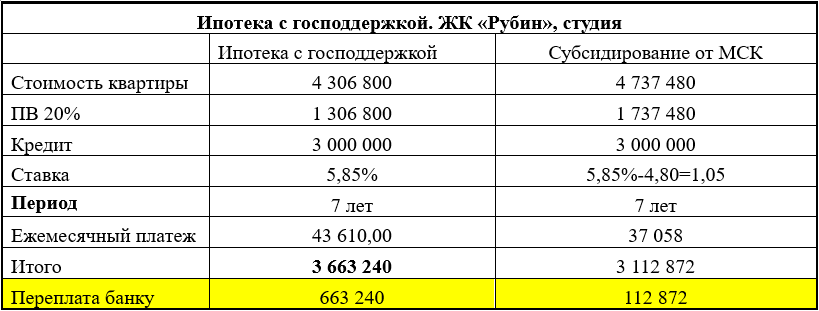 Рассмотрим наглядно выгоду для клиента «МСК» на примере покупки студии с господдержкой до трёх миллионов рублей в ЖК «Рубин».