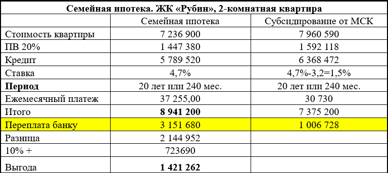 Выгода для клиента «МСК» на примере покупки двухкомнатной квартиры в ЖК «Рубин» по программе семейной ипотеки.