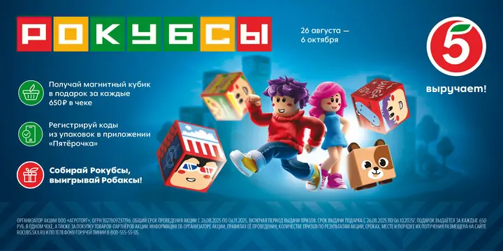 В магазинах «Пятёрочка» стартовала детская акция «Рокубсы»*, которая продлится до 6 октября. Покупатели торговой сети смогут собрать креативную коллекцию магнитных кубиков с яркими персонажами и элементами городской среды, а также принять участие в еженедельных розыгрышах подарков. Главный приз — миллион рублей, а победитель мобильной игры отправится за приключениями в Китай.