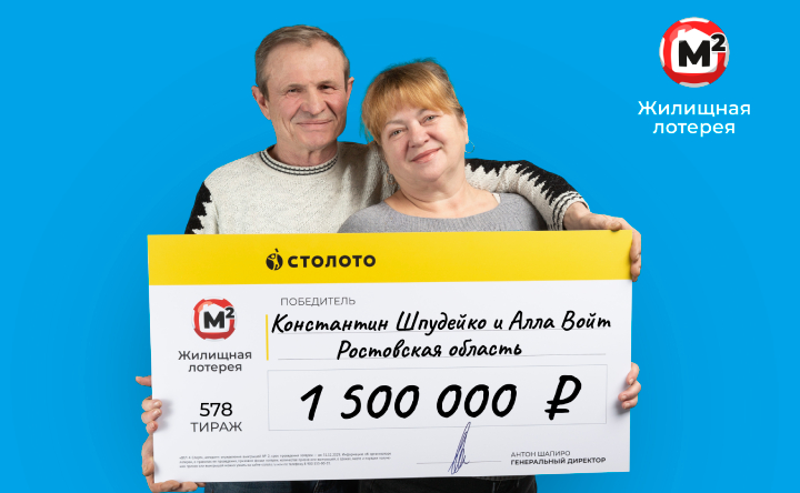 Жители Ростовской области — военный пенсионер Константин Шпудейко и его супруга Алла Войт — стали миллионерами. По итогам 578-го тиража «Жилищной лотереи» семья выиграла 1,5 млн рублей.