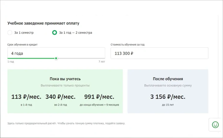 Размер образовательного кредита зависит от стоимости обучения. Процентная ставка остаётся фиксированной на весь срок и составляет 3% годовых. На время студенческой жизни действует льготный период, когда платить нужно только проценты.