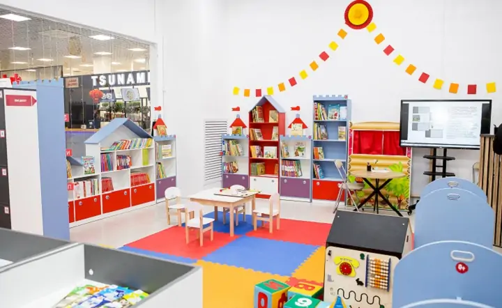 В библиотеке, которая, казалось бы, выглядит небольшой, расположено множество зон: открытое пространство для чтения, для игр, для ожидания, выделены зоны уединённого чтения, компьютерные, инфо-холл (взрослое и детское отделение), зал художественной литературы, интеллект-зал, событийный зал, зона для мастер-классов, зона семейного чтения, зал для игр (детская площадка).
