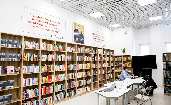 Библиотека имени великого писателя Льва Толстого расположена на первом этаже торгового центра. Это достаточно проходное место, плюс рядом находится фудкорт. Обычно библиотека считается «обителью тишины», но, по словам Натальи Нецветайло, нахождение библиотеки в ТЦ никак не мешает читателям.