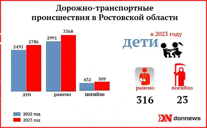 С участием детей в 2023 году в Ростовской области было зарегистрировано 295 ДТП, в них были ранены — 316, погибли — 23.