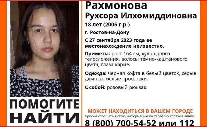 В Ростове продолжаются поиски 18-летней Рухсоры Рахмоновой. Ориентировку на пропавшую девушку в своём Telegram-канале разместил поисковый отряд «ЛизаАлерт». По данным волонтёрской организации, девушку последний раз видели